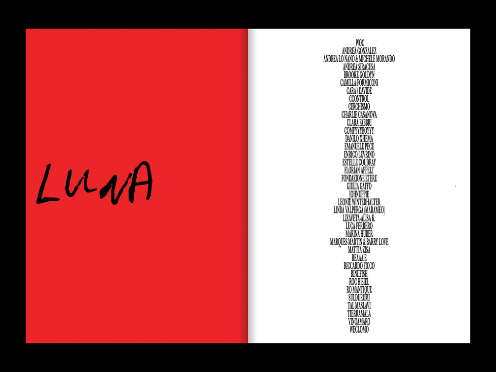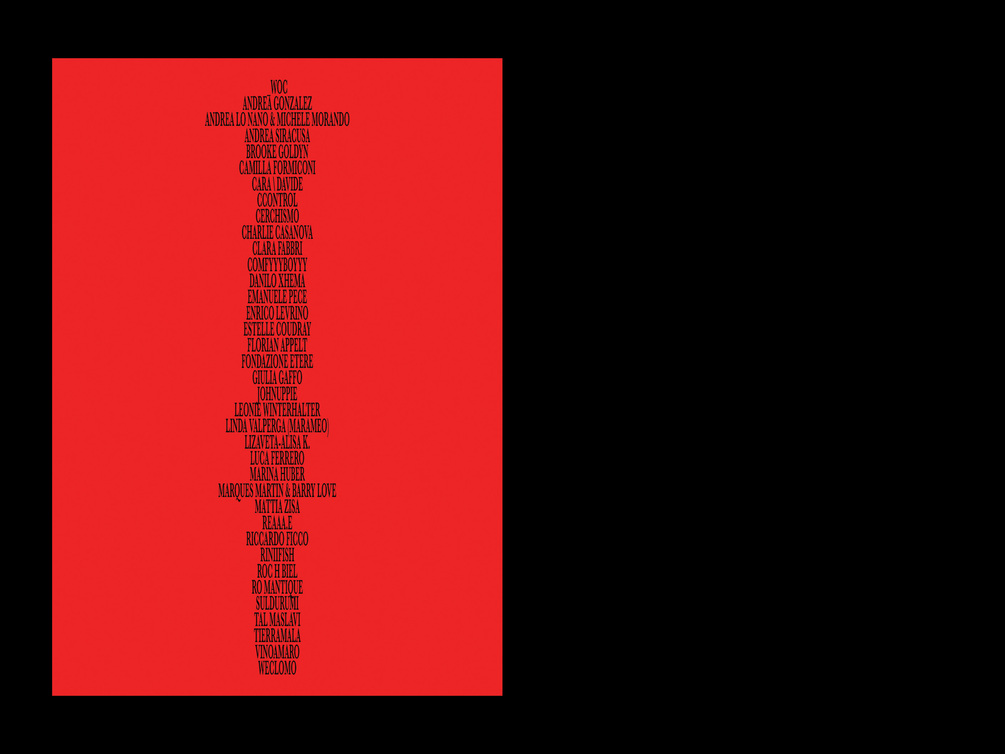 The first number, Issue 01 Spring 2024, features works from _woc, Andrea Gonzalez, Andrea Lo Nano & Michele Morando, Andrea Siracusa, Brooke Goldyn, Camilla Formiconi, CARA \ DAVIDE, Ccontrol, Cerchismo, Charlie Casanova, Clara Fabbri, ComfyyyBoyyy, Danilo Xhema, Emanuele Pece, Enrico Levrino, Estelle Coudray, Florian Appelt, Fondazione Etere, Giulia Gaffo, Johnuppie, Leonie Winterhalter, Linda Valperga (MARAMEO), Lizaveta-Alisa K., Luca Ferrero, Marina Huber, Marques Martin & Barry Love, Mattia Zisa, Reaaa.e, Riccardo Ficco, Riniifish, Roc H Biel, Ro Mantique, Suldurumi, Tal Maslavi, Tierramala, Vinoamaro, weclomo.